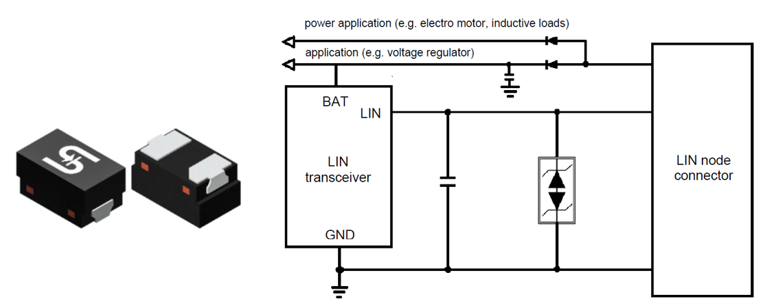 The TESDA1L2B17P1Q1 is an ESD protection device designed for a single LIN bus signal line, providing effective immunity against electrostatic discharge and transient surge events. Typical LIN applications include seat control systems, door locking modules, mirror adjustment units, and sensor interfaces such as rain sensors.
