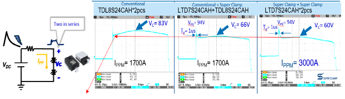 Additionally, the Super Clamp series can handle much higher pulse currents within the same package size i.e., ~300A in DO-218AB versus 170A for traditional TVSs. In other words, under the same voltage conditions, a single Super Clamp device can deliver the current capability equivalent to that of two conventional TVSs. This allows for significant PCB space savings when using Super Clamp.